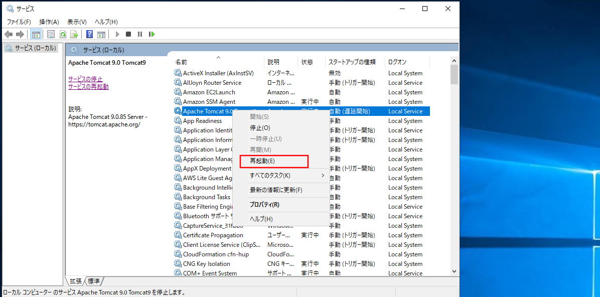 サービスからApache Tomcat 9.0を再起動します。