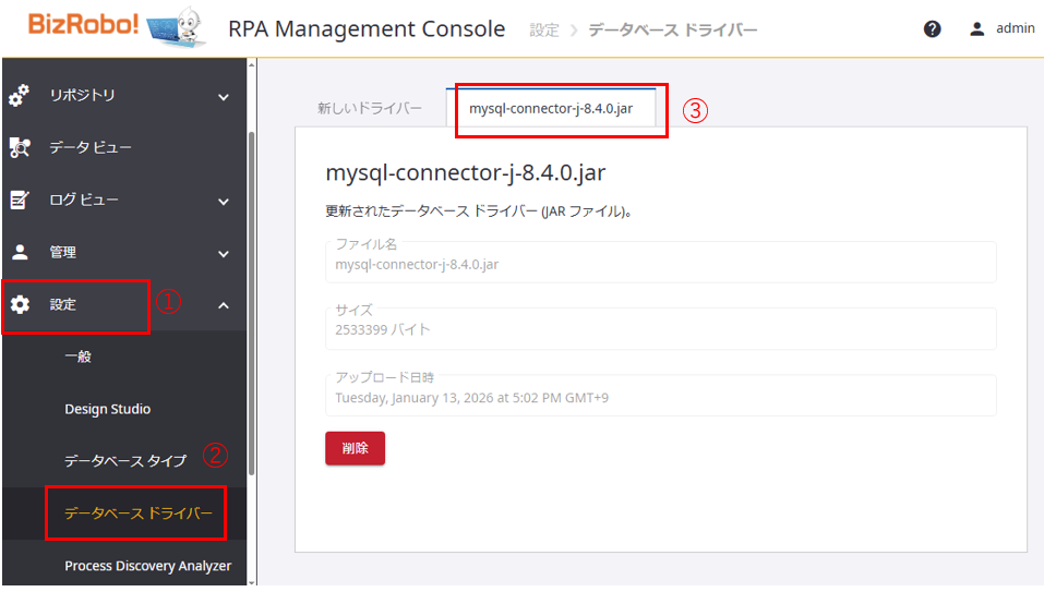 JDBCドライバーのアップロードで行った作業を確認します。