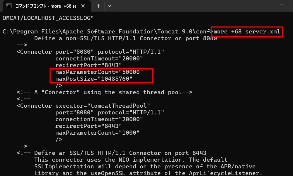 アクセスログの表示方法を確認します。以下をコマンドプロンプトに貼り付け、[maxPostSize="10485760"][maxParameterCount="50000"]が表示されているか確認します。