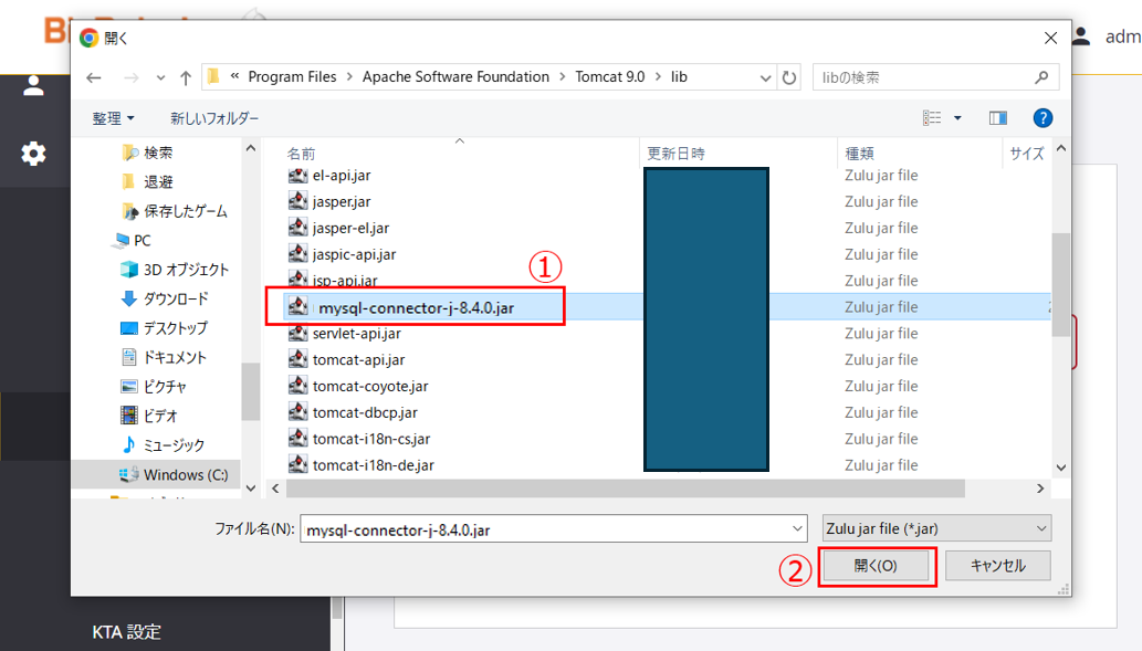 以下のフォルダ内にある①mysql-connector-j-8.4.0.jarを選択し、②[開く]をクリックします。